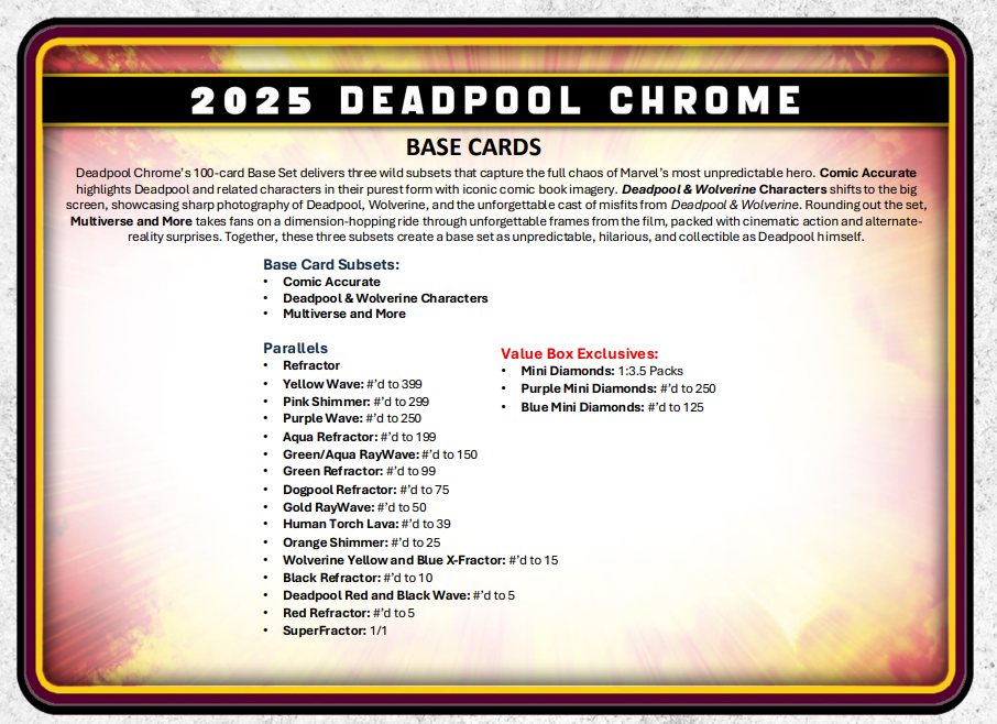 Deadpool Chrome's 100-card Base Set delivers three wild subsets that capture the full chaos of Marvel's most unpredictable hero. Comic Accurate highlights Deadpool and related characters in their purest form with iconic comic book imagery. Deadpool & Wolverine Characters shifts to the big screen, showcasing sharp photography of Deadpool, Wolverine, and the unforgettable cast of misfits from Deadpool & Wolverine. Rounding out the set, Multiverse and More takes fans on a dimension-hopping ride through unforgettable frames from the film, packed with cinematic action and alternate-reality surprises. Together, these three subsets create a base set as unpredictable, hilarious, and collectible as Deadpool himself.