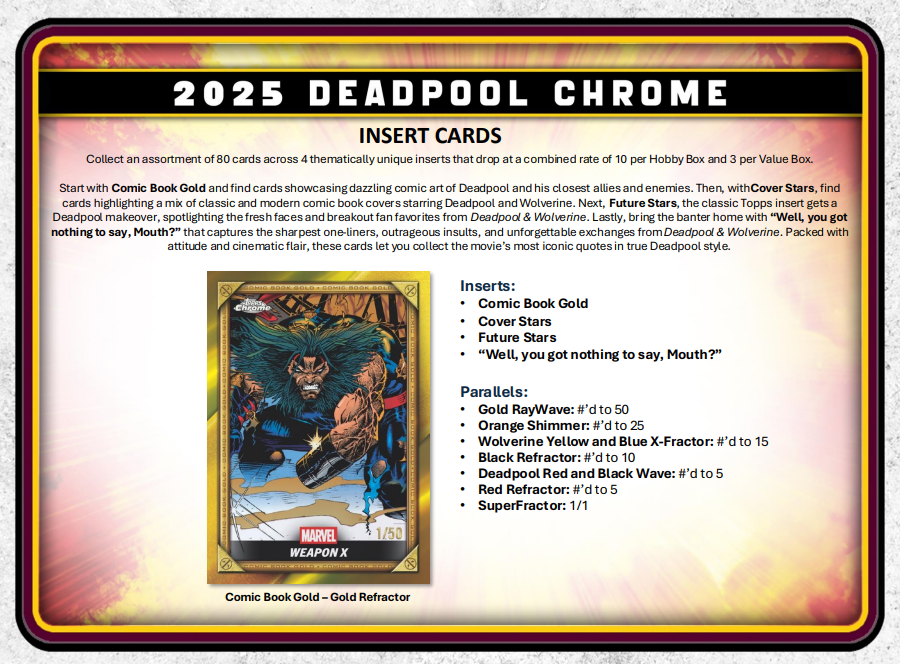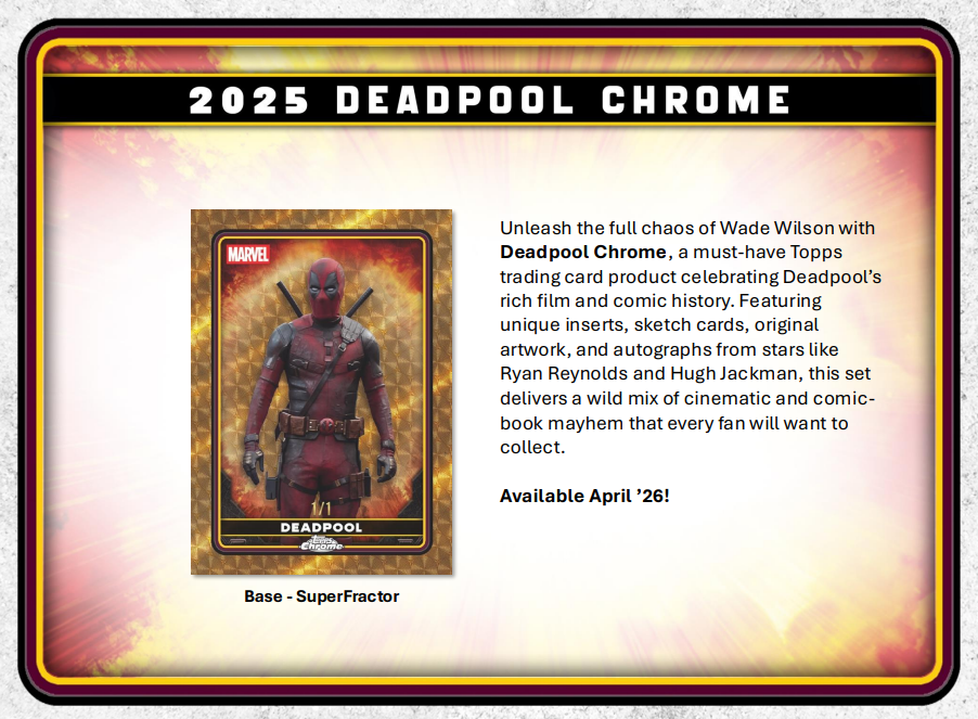 - Unleash the full chaos of Wade Wilson with 2025 Topps Deadpool Chrome, a must-have trading card release celebrating Deadpool’s rich comic and cinematic history.Featuring a dynamic 100-card Base Set, dazzling Chrome parallels, rare case hits, sketch cards, original artwork, and autographs from stars like Ryan Reynolds and Hugh Jackman, this product delivers a wild mix of comic-book mayhem and big-screen action